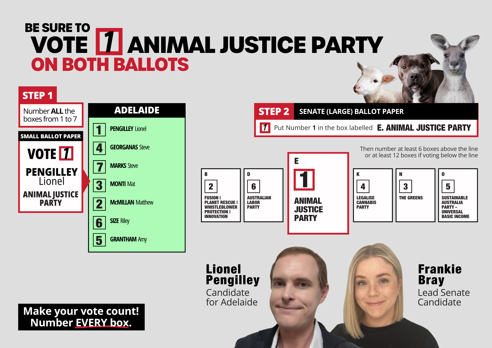 Lionel Pengilley has a passion to improve the lives of animals and build a more sustainable society. An outlet for his passion is the Animal Justice Party. Since joining the Animal Justice Party, Lionel has volunteered in a number of capacities, including as state treasurer. He believes we should speak up for the voiceless and we can implement a kinder society for all.